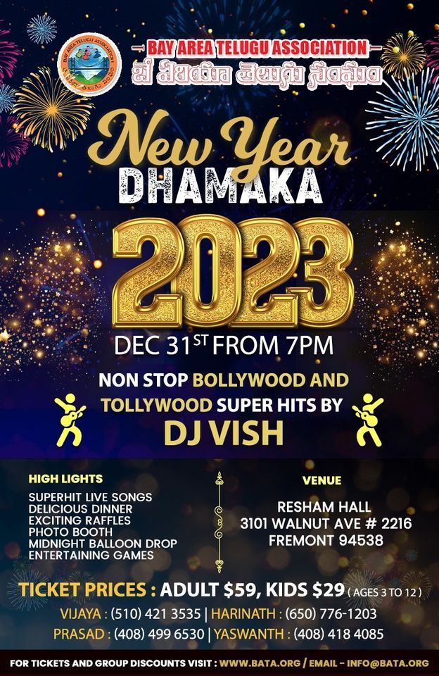 BlogNew Year Dhamaka 2025, 3101 Walnut Ave, Fremont, CA 94538 2216 Fremont, California Upcoming Indian Events, Music Festival Bollywood Dhamaka 2025 New Years Eve Party, The Empire Banquet Bata New Year Dhamaka 2025 Tickets, Sat, Dec 31, 2025 at 7:00 PM Dance Classes In Garden Grove, CA | Dance Workshops & Dance New Year Dhamaka 2025, 3101 Walnut Ave, Fremont, CA 94538 2216 Bay Area Telugu Association Home | Facebook New year eve 2025 Mirchi Dhamaka, Grand Resort Hotel, Mount Happy new year 2025 wish text on colorful ftirework explosion